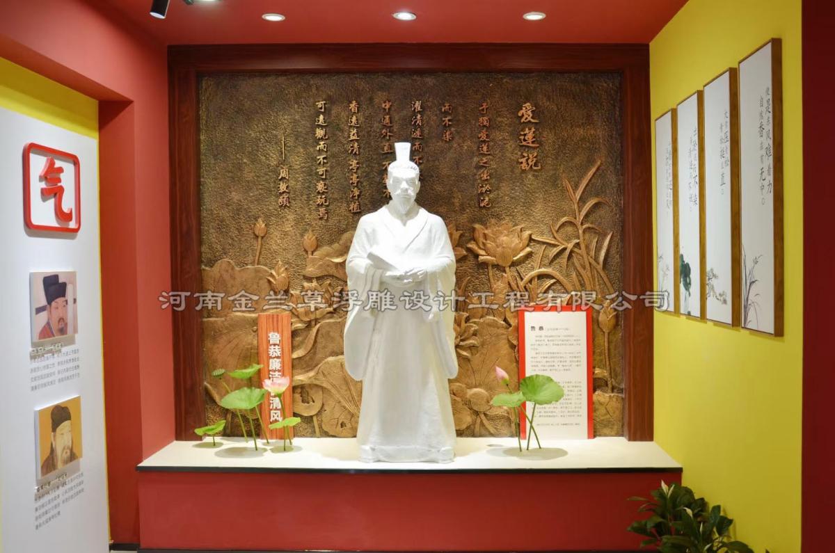 廉政展厅为郑州市中某县刘集镇,雕塑人物为《爱莲说》作者周敦颐,人物手工雕刻,确认满意后采用玻璃钢材质,后期做白色处理。整个雕塑后期效果较好,配以爱莲说的浮雕背景墙,显的很高端大气,受到客户的认可。
